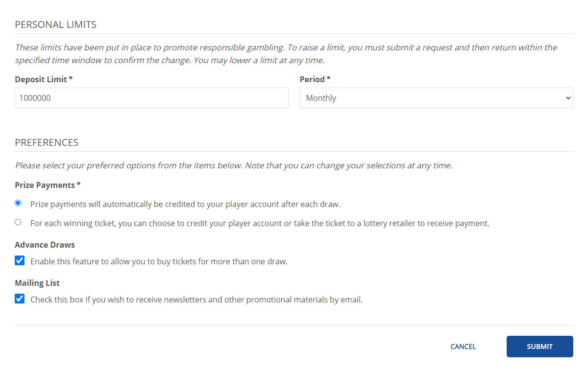 3. From this screen you can update your personal information, address, contact information, and prize payment preferences. You can also opt in or out of the mailing list.