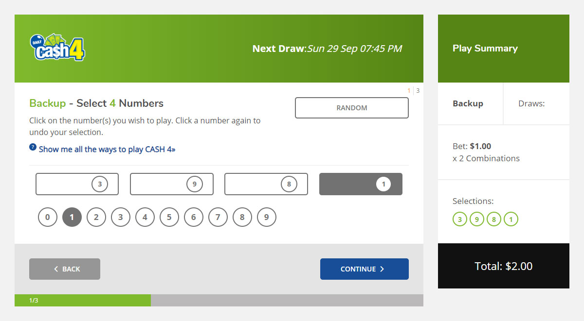 3. On the number selection screen, pick 5 numbers to play. Alternatively, choose the Random button and the computer will select them for you. Your selected numbers will appear in the Play Summary box on the right of the screen. For alternate game types click on “Show me all the ways to play Cash 4” to view the different game modes.
