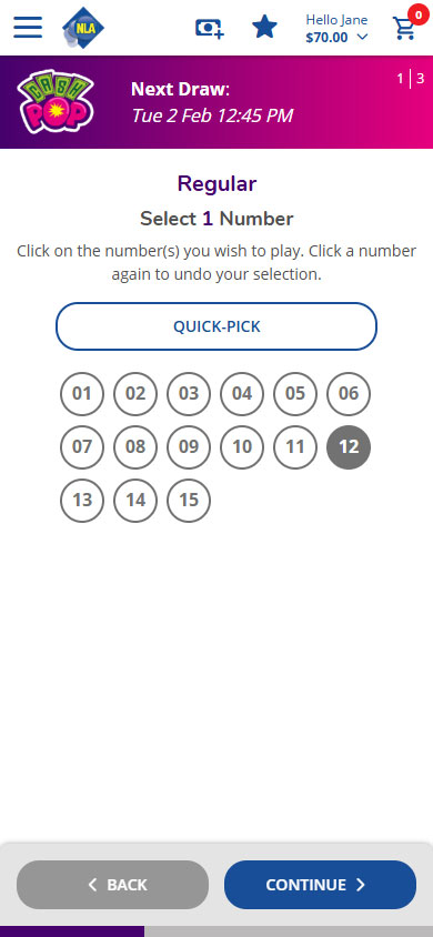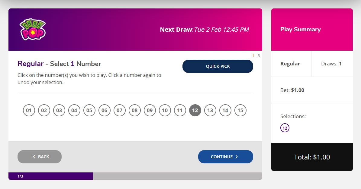 3. On the number selection screen, pick 1 numbers to play. Alternatively, choose the Quick Pick button and the computer will select them for you. Your selected number will appear in the Play Summary box on the right of the screen.
