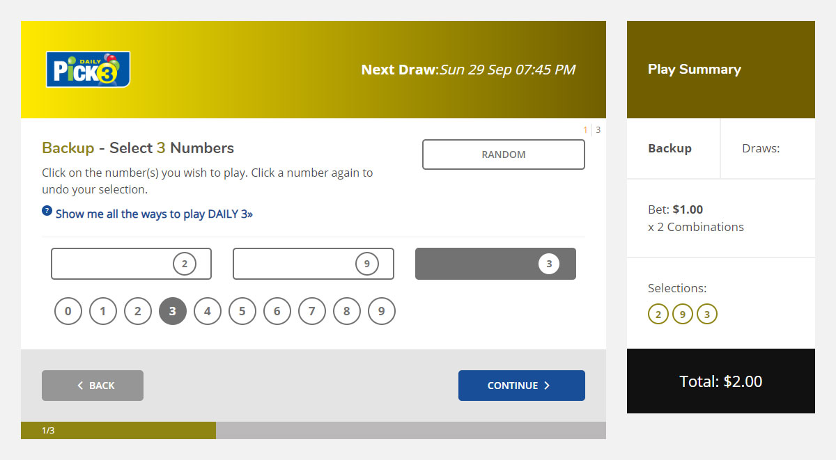 3. On the number selection screen, pick 3 numbers to play. Alternatively, choose the Random button and the computer will select them for you. Your selected numbers will appear in the Play Summary box on the right of the screen. For alternate game types click on "Show me all the ways to play Daily 3" to view the different game modes.