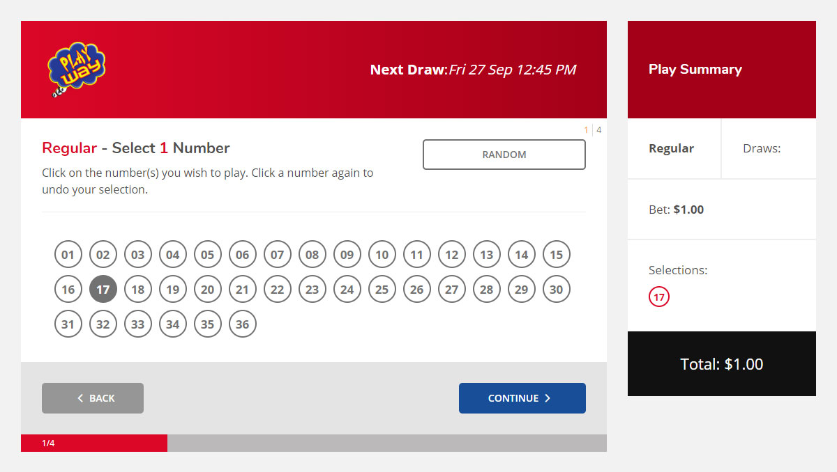 3. On the number selection screen, pick 5 numbers to play. Alternatively, choose the Random button and the computer will select them for you. Your selected numbers will appear in the Play Summary box on the right of the screen. For alternate game types click on "Show me all the ways to play Lotto" to view the different game modes.